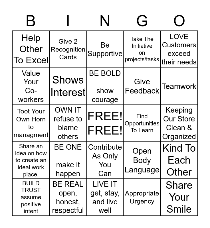 This bingo card has a free space and 24 words: BE ONE make it happen, BE REAL open, honest, respectful, BE BOLD show courage, BUILD TRUST assume positive intent, LOVE Customers exceed their needs, Help Other To Excel, Value Your Co-workers, Give 2 Recognition Cards, Find Opportunities To Learn, Contribute As Only You Can, Give Feedback, Toot Your Own Horn to managment, Open Body Language, Kind To Each Other, Shows Interest, Appropriate Urgency, Keeping Our Store Clean & Organized, Be Supportive, Teamwork, OWN IT refuse to blame others, Share Your Smile, Share an idea on how to create an ideal work place., Take The Initiative on projects/tasks and LIVE IT get, stay, and live well.