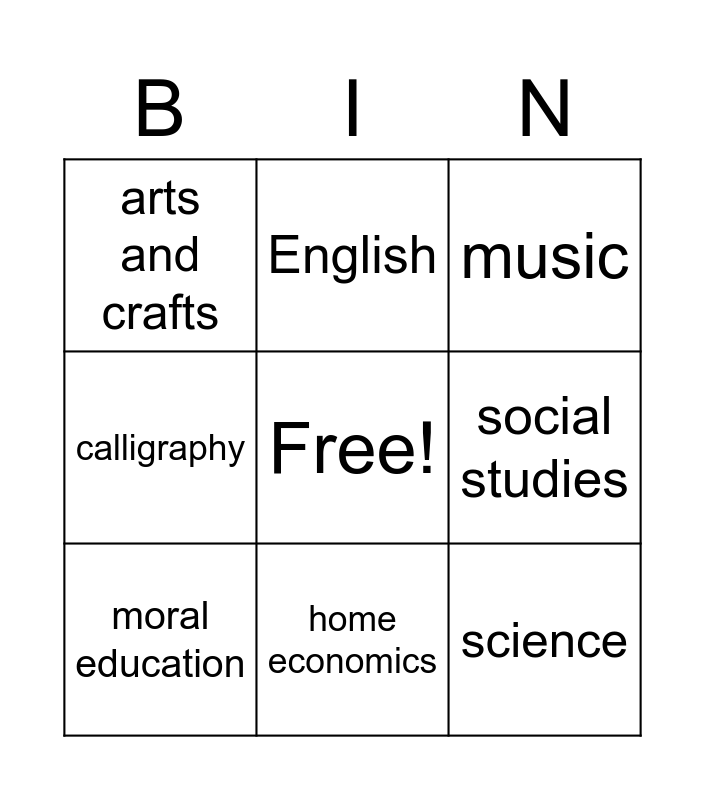This bingo card has a free space and 12 words: Japanese, math, science, social studies, English, music, home economics, P.E, arts and crafts, calligraphy, moral education and artist.