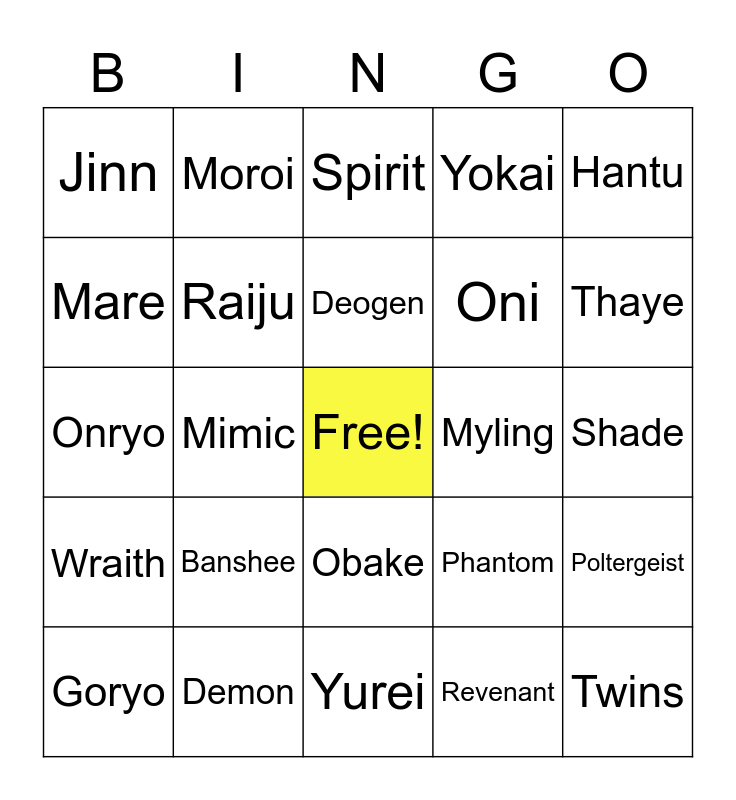 This bingo card has a free space and 24 words: Banshee, Demon, Deogen, Goryo, Hantu, Jinn, Mare, Moroi, Myling, Obake, Oni, Onryo, Phantom, Poltergeist, Raiju, Revenant, Shade, Spirit, Thaye, Mimic, Twins, Wraith, Yokai and Yurei.