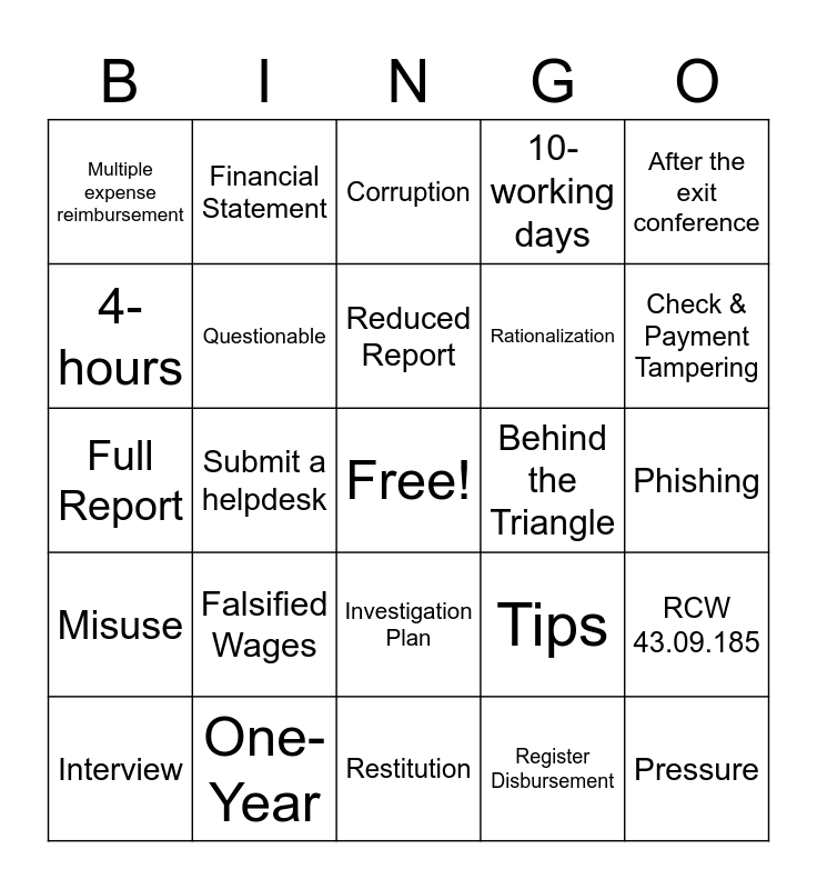 This bingo card has a free space and 42 words: Segregation of Duties, Reduced Report, Subpoena, Falsified Wages, Register Disbursement, RCW 43.09.185, Pressure, Larceny, Corruption, Investigation Plan, Phishing, Check & Payment Tampering, Submit a helpdesk, After the exit conference, Overstated expense reimbursement, Tips, Mid-month draws, Full Report, Mischaracterized expense reimbursement, Financial Statement, 4-hours, Subject, Opportunity, Multiple expense reimbursement, Ghost Employee, Misappropriation, Rationalization, Skimming, Lapping, Fictitious expense reimbursement, Fraud, Misuse, Questionable, Restitution, External Review Checklist, Interview, One-Year, Behind the Triangle, Preliminary Assessment Worksheets, Go to Court, 10-working days and Shell Company.