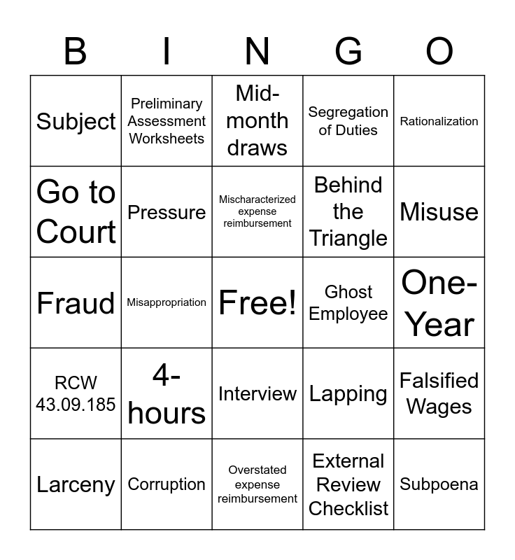 This bingo card has a free space and 42 words: Full Report, Mischaracterized expense reimbursement, Financial Statement, 4-hours, External Review Checklist, Falsified Wages, Subpoena, Investigation Plan, Mid-month draws, Interview, One-Year, Misuse, Misappropriation, Rationalization, Skimming, Lapping, Fictitious expense reimbursement, Fraud, 10-working days, Preliminary Assessment Worksheets, Go to Court, Phishing, Check & Payment Tampering, Subject, Opportunity, Multiple expense reimbursement, Behind the Triangle, Shell Company, Restitution, Questionable, Register Disbursement, RCW 43.09.185, Pressure, Overstated expense reimbursement, Tips, Larceny, Corruption, Ghost Employee, Submit a helpdesk, After the exit conference, Segregation of Duties and Reduced Report.