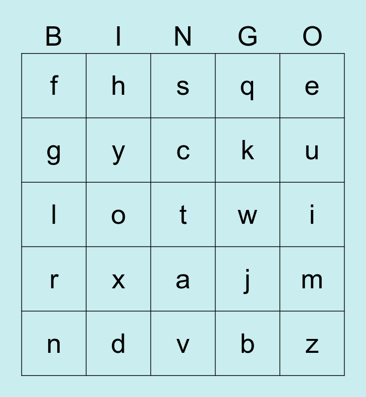 This bingo card has 26 words: a, b, c, d, e, f, g, h, i, j, k, l, m, n, o, p, q, r, s, t, u, v, w, x, y and z.