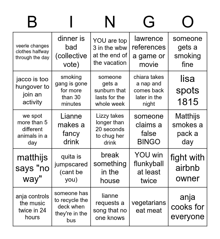 This bingo card has 65 words: Jacco gets a stomach tan line, someone gets lost in Lissabon, fight with airline people to get a drunk person on the plane, fight with airbnb owner, 3+ people puke in a single night, YOU drink half a crate at least twice, dinner is bad (collective vote), car/scooter problems, someone gets a sunburn that lasts for the whole week, 20,000 steps in one day, break something in the house, someone burps or farts impressively loudly, Matthijs smokes a pack a day, someone gets a smoking fine, someone gets lost, jacco is too hungover to join an activity, Lianne makes a fancy drink, veerle changes clothes halfway through the day, ian fist-bumps everyone when going to bed, chiara takes a nap and comes back later in the night, quita is jumpscared (cant be you), matthijs says "no way", lawrence references a game or movie, lisa cheats at a game, brian uses being old as an excuse, bas talks about investment opportunities, ivan tells a bullshit story, bart does exercise (not just walking), Lizzy takes longer than 20 seconds to chug her drink, aleida befriends locals, anja controls the music twice in 24 hours, tristan makes plans to stop smoking, someone forgot something important, something is taken by airport security, YOU win flunkyball at least twice, someone has to recycle the deck when they're in the bus, any of the couples (official and unofficial) disappear together, we spot more than 5 different animals in a day, vegetarians eat meat, 6 people go to smoke at the same time, smoking gang is gone for more than 30 minutes, people go skinny dipping, someone claims a false BINGO, ivan injures himself, lianne talks about tanzania, brian talks about chess, lisa spots 1815, quita dresses like shes going to a festival, anja cooks for everyone, tristan goes to bed first, veerle befriends local wildlife, lawrence streams sports, lizzy does gymnastics, lianne requests a song that no one knows, chiara gets too drunk, Bas denies coming from Urk, ians conversation with locals takes too long, YOU are top 3 in the wbw at the end of the vacation, there is drama!, aleida surprises the group with a special skill, YOU are final 3 that goes to bed, YOU join someone for a chug even though you don't have to, Brian or Ivan go dad mode, Someone ruins a piece of their clothing and Ivan or Lisa steal something.