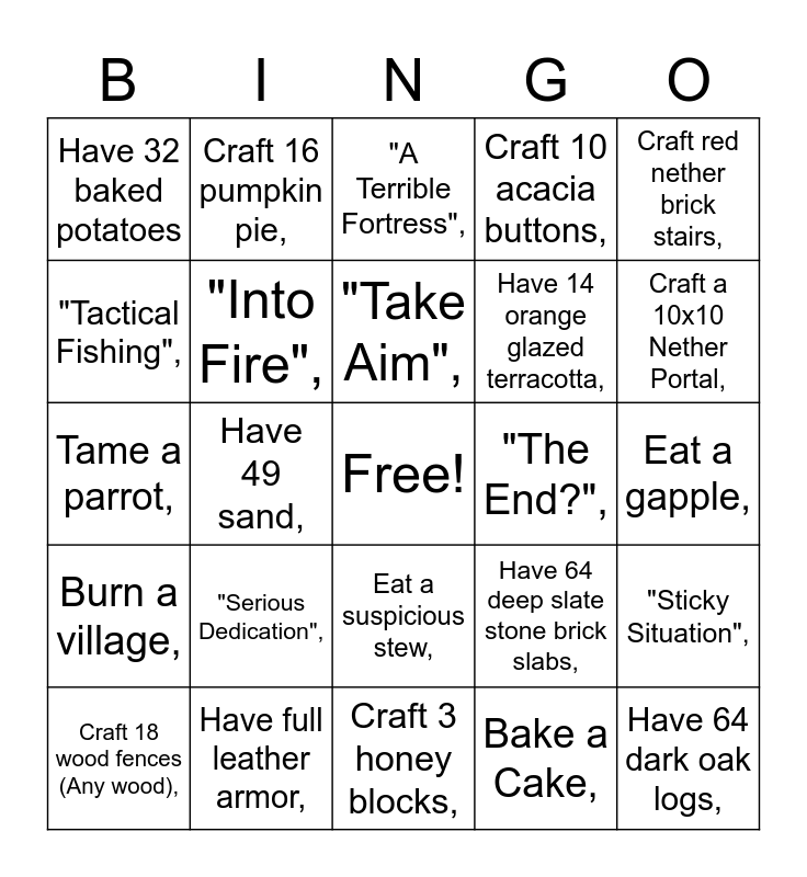 This bingo card has a free space and 138 words: "On a rail",, "Monster Hunter",, "When pigs fly",, "Diamonds!",, "Local Brewery",, "The End?",, "Enchanter",, "The Beginning.",, Have all stone tools,, Have all wooden tools,, Have all gold tools,, Have all iron tools,, "Leader of the Pack",, "Best Friends Forever",, "Hired Help",, Wear a full suit of Iron Armor,, Eat a gapple,, "Sweet Dreams",, "Sky's the Limit",, "Postmortal",, "Bee our Guest",, "Sticky Situation",, Craft 3 honey blocks,, "Bullseye",, Make a banner,, "Serious Dedication",, "A seedy Place",, Have 16 white wool,, Have 64 oak logs,, Have 64 acacia logs,, Have 64 dark oak logs,, Have 64 birch logs,, Have 18 yellow wool,, Bake a Cake,, "Suit Up!",, "Isn't it Iron Pick",, Grow a tree in the Nether,, "Not Today, Thank You",, Have a banner on your shield,, "Hot Stuff",, "Cover Me with Diamonds",, "Eye Spy",, "Subspace Bubble",, "Return to Sender",, "Those were the Days",, "A Terrible Fortress",, "Oh Shiny",, "Country Lode, take me Home",, "Cover me in Debris",, "Hot Tourist Destinations",, "What A Deal!",, Burn a village,, Sneak 100,, "Is it a Balloon?",, "It Spreads",, "Take Aim",, Have 14 pink dye,, Have 16 cactus,, Have 32 cooked steak,, Have 11 ink sacs,, "Light as a rabbit",, Have full leather armor,, Have full gold armor,, Have full diamond armor,, "You've Got a friend in Me",, Kill 16 zombies,, "Fishy Business",, Have 12 Copper blocks,, "Tactical Fishing",, Be a vegetarian,, Have 24 blue dye,, "the Cutest Predator",, Get a Goat horn,, Breed any animal,, Craft 10 Furnances,, Craft 8 smokers,, Have 16 crafting tables,, Have 32 light gray glass panes,, Have 49 sand,, Craft a hopper,, Kill a Hoglin,, Ride a Strider,, Have all diamond tools,, Craft 16 pumpkin pie,, Craft 8 redstone blocks,, Have a stack of redstone dust,, Have all enchanted armor, H, ave 16 moss blocks,, Have 64 deep slate stone brick slabs,, Craft 16 chests,, Craft 5 barrels,, Make a dirt hut (at least 3x3),, Have 23 sweet berries,, Craft 18 wood fences (Any wood),, Craft 10 acacia buttons,, Kill 7 husks,, "Voluntary Exile",, Milk a cow,, Eat a suspicious stew,, Harvest 16 wheat,, Harvest 24 carrots,, Craft 10 golden carrots,, Craft red nether brick stairs,, Get killed by "Intentional Game design",, Die to a Phantom,, Get a Creeper to blow up another mob,, "A throw away joke",, Have a poisonous potato,, Have 16 zombie flesh,, Have every villager workstation,, "Spooky Scary Skeleton",, "Into Fire",, Kill 5 Blaze,, Collect 35 flint,, Craft a flint and steel,, "We Need To Go Deeper",, Craft a 10x10 Nether Portal,, "Get an upgrade",, "Hidden in the Depths",, "Who is Cutting Onions?",, "War Pigs", Craft a Jukebox,, Obtain any music disk,, Have 64 bamboo,, Craft scaffolding,, Tame a parrot,, Craft 17 jungle wood stairs,, Have 14 orange glazed terracotta,, Drown,, Craft TNT,, Freeze to death,, Have a bucket of powdered snow,, Suffocate in a wall, Name a mob., Have 32 baked potatoes, Have fully enchanted armor, Tame a cat., Bake cookies. and Have a bone block.
