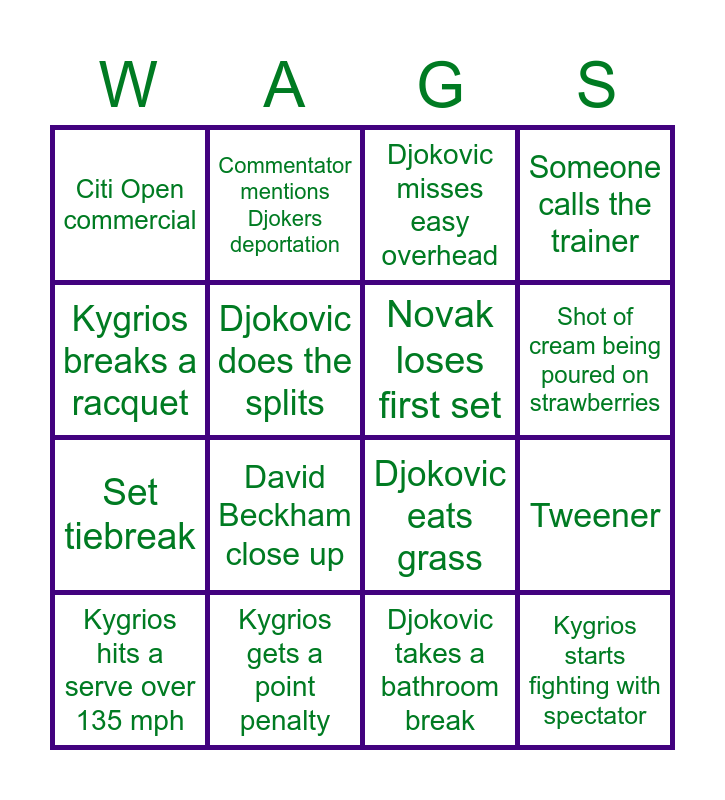 This bingo card has 20 words: Tweener, Kygrios underhand serves, Djokovic misses easy overhead, Kygrios demands to see the supervisor, Kygrios hits a serve over 135 mph, Kygrios breaks a racquet, Kygrios gets a point penalty, Citi Open commercial, Set tiebreak, Commentator mentions Djokers deportation, David Beckham close up, Djokovic eats grass, Djokovic does the splits, Kygrios starts fighting with spectator, Novak loses first set, Djokovic breaks a racquet, Shot of cream being poured on strawberries, Someone calls the trainer, Djokovic takes a bathroom break and Djokovic wife shown on camera with her eyes closed.