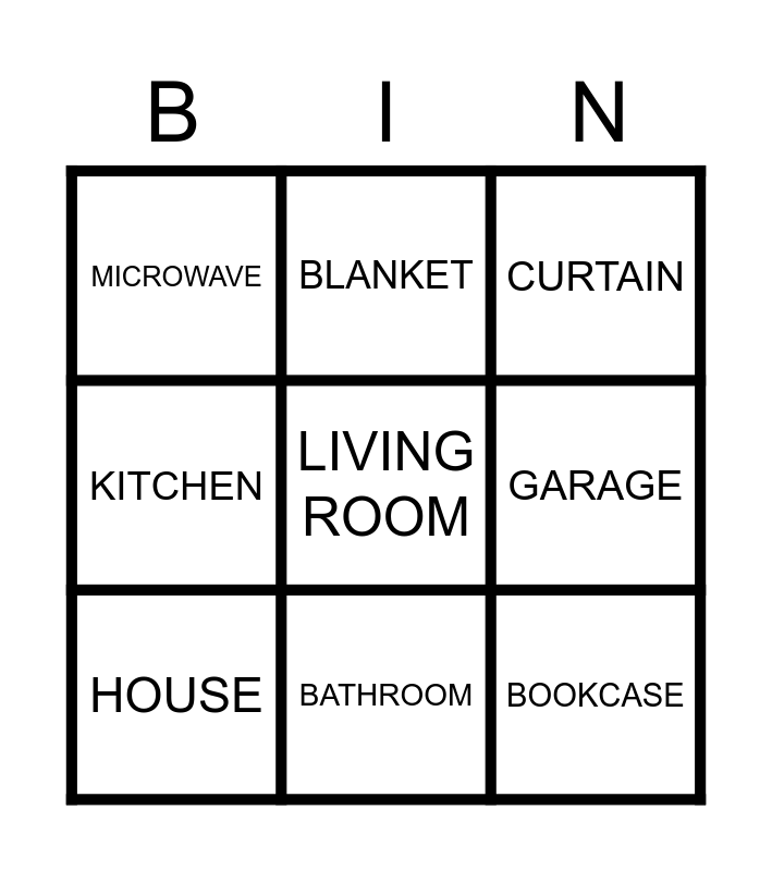 This bingo card has a free space and 8 words: GARAGE, CURTAIN, BLANKET, HOUSE, MICROWAVE, BOOKCASE, KITCHEN and BATHROOM.