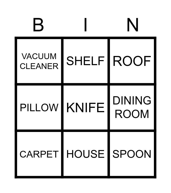 This bingo card has a free space and 8 words: DINING ROOM, ROOF, SHELF, CARPET, VACUUM CLEANER, SPOON, PILLOW and HOUSE.