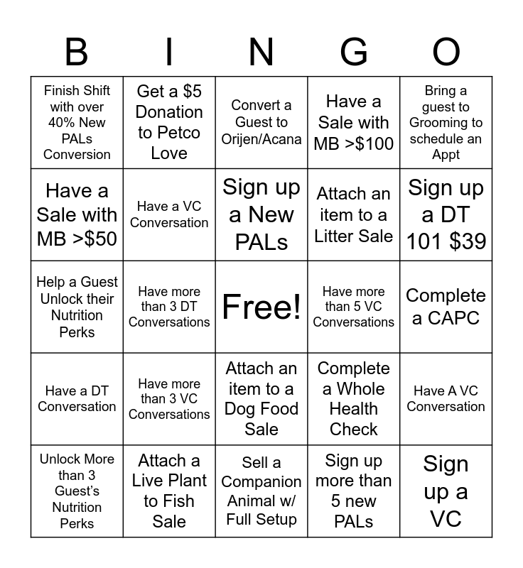 This bingo card has a free space and 28 words: Have A VC Conversation, Sign up a New PALs, Attach an item to a Litter Sale, Sign up more than 5 new PALs, Have a Sale with MB >$50, Convert a Guest to Orijen/Acana, Get a $5 Donation to Petco Love, Have a DT Conversation, Have more than 5 VC Conversations, Unlock More than 3 Guest’s Nutrition Perks, Help a Guest Unlock their Nutrition Perks, Have a Sale with MB >$100, Attach a Live Plant to Fish Sale, Sell a Companion Animal w/ Full Setup, Sign up a DT 101 $39, Convert a Guest to WholeHearted, Have more than 3 VC Conversations, Have a VC Conversation, Sign up a New PALs, Attach an item to a Dog Food Sale, Finish Shift with over 40% New PALs Conversion, Attach an item to a Cat Food Sale, Sign up a VC, Have more than 3 DT Conversations, Complete a CAPC, Complete a Whole Health Check, Bring a guest to Grooming to schedule an Appt and Take a selfie with a Guest’s Pet that you helped *must be shown to LOD and LOD must initial box*.