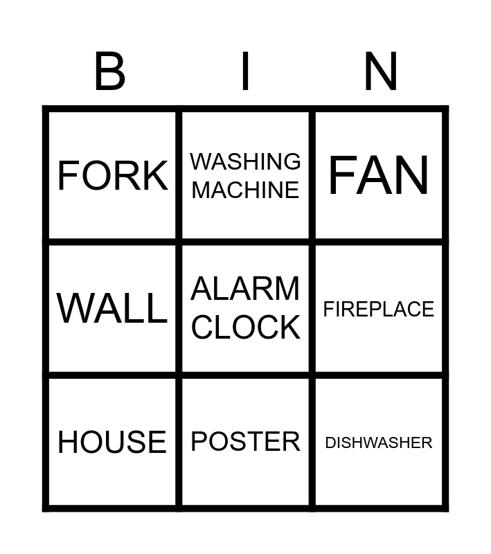 This bingo card has a free space and 8 words: FIREPLACE, FAN, WASHING MACHINE, HOUSE, FORK, DISHWASHER, WALL and POSTER.