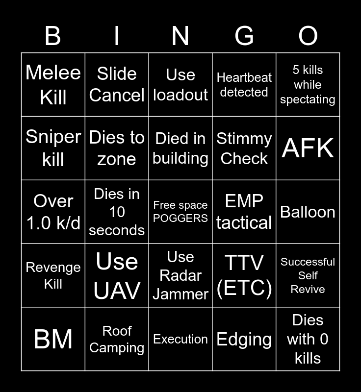 This bingo card has a free space and 24 words: Use UAV, Roof Camping, Died in building, BM, 5 kills while spectating, Melee Kill, Sniper kill, Slide Cancel, EMP tactical, Use Radar Jammer, Stimmy Check, Over 1.0 k/d, TTV (ETC), Successful Self Revive, Dies to zone, Edging, Balloon, Use loadout, AFK, Dies in 10 seconds, Dies with 0 kills, Revenge Kill, Heartbeat detected and Execution.