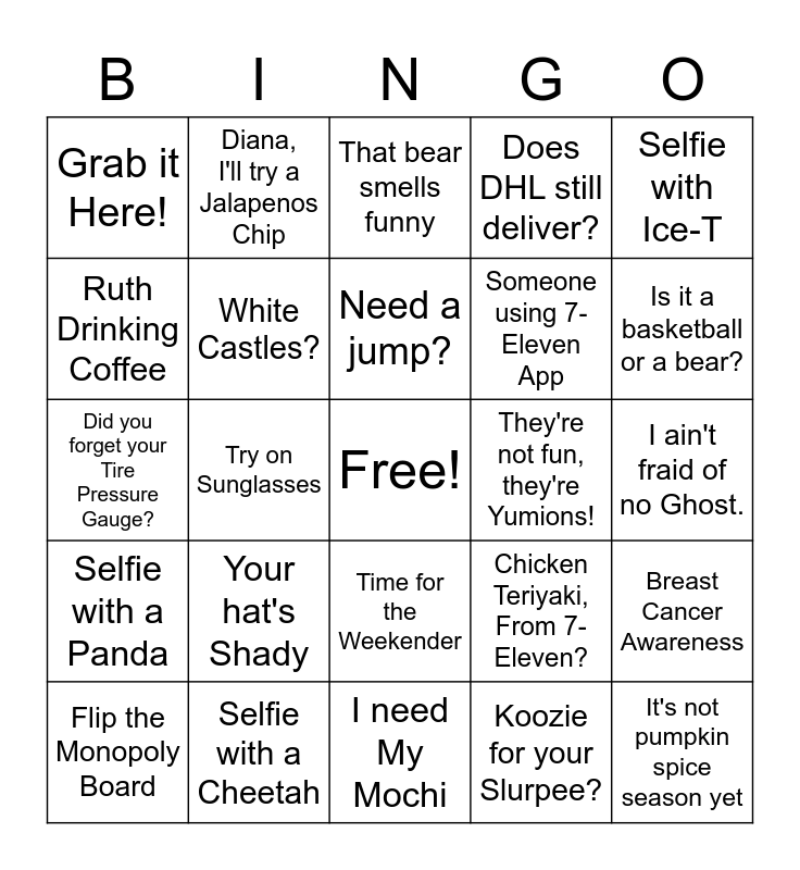 This bingo card has 1 images, a free space and 43 words: Need a spare key?, Your hat's Shady, How Cute! Black Panther, Koozie for your Slurpee?, Who still eats Hot Pockets?, I hope that Liquid Death doesn't kill me, White Castles?, Which flavor of Slurpee Pop?, Does DHL still deliver?, It's not pumpkin spice season yet, Grab it Here!, Selfie with a Cheetah, Chicken Teriyaki, From 7-Eleven?, I ain't fraid of no Ghost., It's Magical, It's Unicorn Popcorn, How much for the Gold Mountain Dew?, I need My Mochi, They're not fun, they're Yumions!, Does anyone need fire sprinkles?, Did you forget your Tire Pressure Gauge?, Diana, I'll try a Jalapenos Chip, Time for the Weekender, Give your friend a Xmas Card, Selfie with Ice-T, Selfie with Patriotic Hat, Try on those Ears, Need a jump?, Reese's have Ridges, Breast Cancer Awareness, Flip the Monopoly Board, TIMBER!, That bear smells funny, I guess you could go fishing in Budd Lake, Beyond meat is a jerk, Selfie with a Panda, Star Light, Star Bright, Pop-it in the Party Center!, Utility lighter? Looks like a torch to me., Is it a basketball or a bear?, Ruth Drinking Coffee, Try on Sunglasses, Someone using 7-Eleven App and Share a Taquito with a friend.