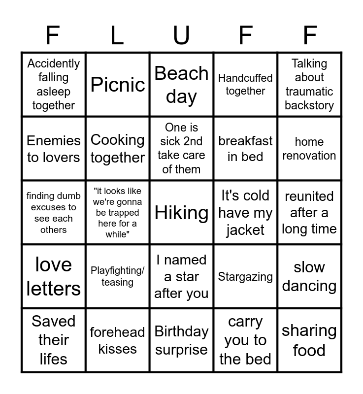This bingo card has 35 words: There's only one bed, Fake dating, Secret dating, Cooking together, I named a star after you, Handcuffed together, Enemies to lovers, CEO and assistant, One is sick 2nd take care of them, Sick confessions, finding dumb excuses to see each others, Talking about traumatic backstory, Nightmares, Wearing each others clothes, Accidently falling asleep together, It's cold have my jacket, carry you to the bed, "it looks like we're gonna be trapped here for a while", love letters, Hiking, Stargazing, Saved their lifes, slow dancing, forehead kisses, Beach day, home renovation, sharing food, wrote you a song, breakfast in bed, reunited after a long time, "this made me think of you", Birthday surprise, Playfighting/ teasing, Picnic and Amnesia.