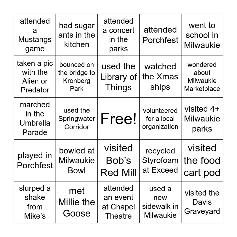 This bingo card has a free space and 24 words: bowled at Milwaukie Bowl, met Millie the Goose, used the Library of Things, slurped a shake from Mike’s, went to school in Milwaukie, attended a Mustangs game, taken a pic with the Alien or Predator, had sugar ants in the kitchen, volunteered for a local organization, visited Bob’s Red Mill, watched the Xmas ships, marched in the Umbrella Parade, recycled Styrofoam at Exceed, visited the food cart pod, bounced on the bridge to Kronberg Park, used a new sidewalk in Milwaukie, visited 4+ Milwaukie parks, attended a concert in the parks, wondered about Milwaukie Marketplace, used the Springwater Corridor, visited the Davis Graveyard, played in Porchfest, attended Porchfest and attended an event at Chapel Theatre.