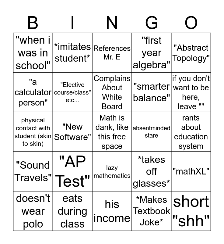 This bingo card has a free space and 32 words: *Makes Textbook Joke*, "Chocolate Chip Cookies", "New Software", "College Calculus", "Sound Travels", "Elective course/class" etc..., "Abstract Topology", "mathXL", *imitates student*, *adjusts glasses*, Complains About White Board, References Mr. E, *puts pencil in mouth*, dumb reference, absentminded stare, "can't compete", doesn't wear polo, physical contact with student (skin to skin), lazy mathematics, "AP Test", *takes off glasses*, talks about other students, rants about education system, eats during class, short "shh", "first year algebra", "smarter balance", "a calculator person", "when i was in school", his income, irrelevant story or fact and if you don't want to be here, leave "".