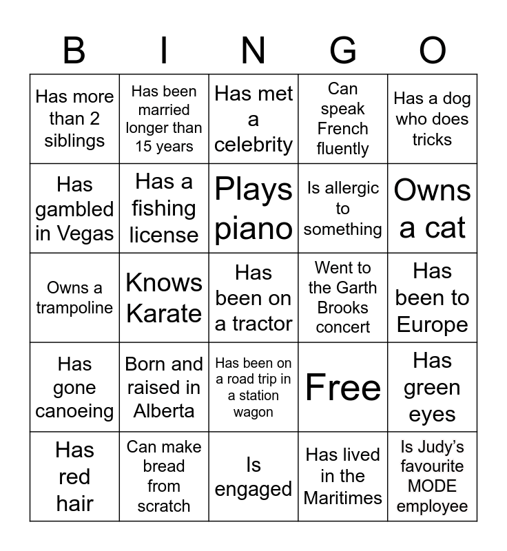 This bingo card has 25 words: Born and raised in Alberta, Is engaged, Plays piano, Has red hair, Has a dog who does tricks, Has more than 2 siblings, Has gambled in Vegas, Has been married longer than 15 years, Went to the Garth Brooks concert, Has been on a road trip in a station wagon, Is allergic to something, Owns a trampoline, Free, Has green eyes, Has a fishing license, Is Judy’s favourite MODE employee, Has been to Europe, Has met a celebrity, Owns a cat, Knows Karate, Has been on a tractor, Can make bread from scratch, Has gone canoeing, Can speak French fluently and Has lived in the Maritimes.