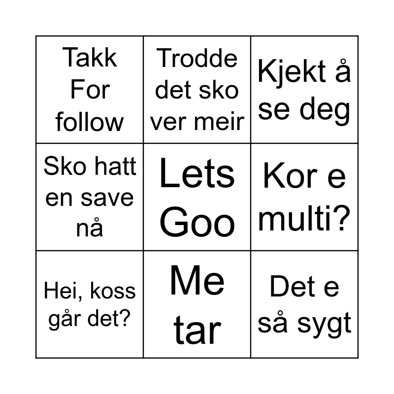 This bingo card has a free space and 8 words: Kor e multi?, Kjekt å se deg, Trodde det sko ver meir, Hei, koss går det?, Takk For follow, Det e så sygt, Sko hatt en save nå and Me tar.