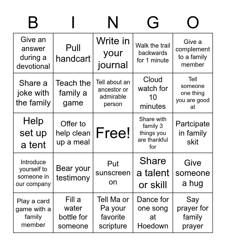 This bingo card has a free space and 24 words: Bear your testimony, Fill a water bottle for someone, Tell about an ancestor or admirable person, Play a card game with a family member, Give a complement to a family member, Give an answer during a devotional, Share a joke with the family, Pull handcart, Share with family 3 things you are thankful for, Put sunscreen on, Cloud watch for 10 minutes, Help set up a tent, Share a talent or skill, Give someone a hug, Teach the family a game, Dance for one song at Hoedown, Partcipate in family skit, Write in your journal, Tell someone one thing you are good at, Offer to help clean up a meal, Say prayer for family prayer, Introduce yourself to someone in our company, Walk the trail backwards for 1 minute and Tell Ma or Pa your favorite scripture.