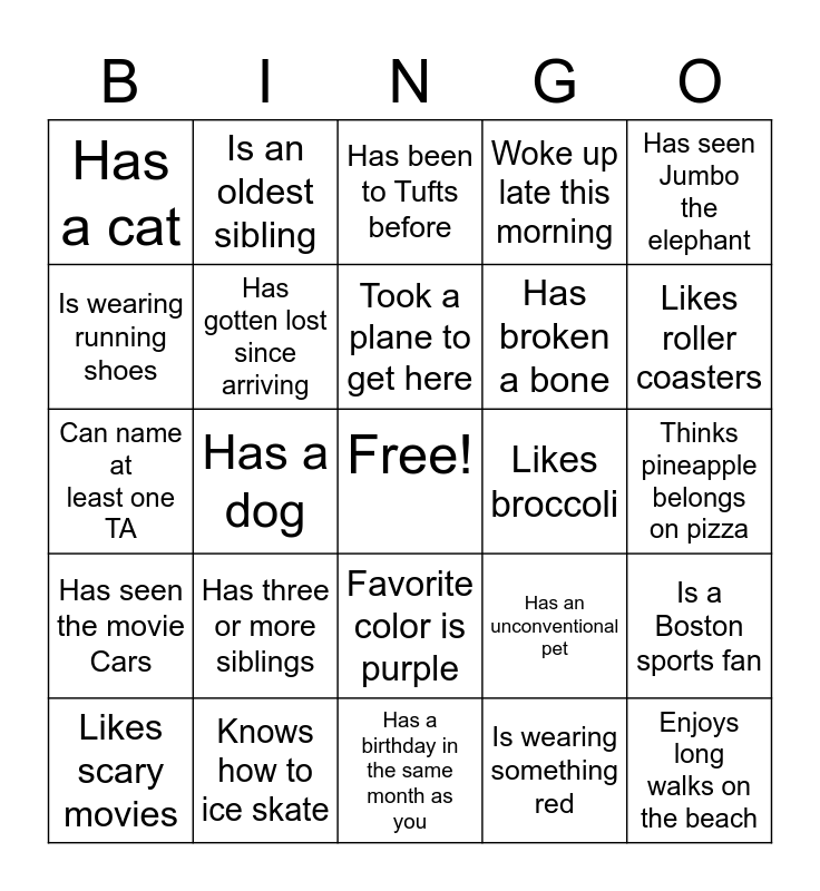 This bingo card has a free space and 24 words: Has three or more siblings, Knows how to ice skate, Took a plane to get here, Likes scary movies, Has seen Jumbo the elephant, Has a cat, Is wearing running shoes, Is an oldest sibling, Likes broccoli, Favorite color is purple, Has broken a bone, Can name at least one TA, Has an unconventional pet, Is a Boston sports fan, Has gotten lost since arriving, Is wearing something red, Thinks pineapple belongs on pizza, Has been to Tufts before, Likes roller coasters, Has a dog, Enjoys long walks on the beach, Has seen the movie Cars, Woke up late this morning and Has a birthday in the same month as you.