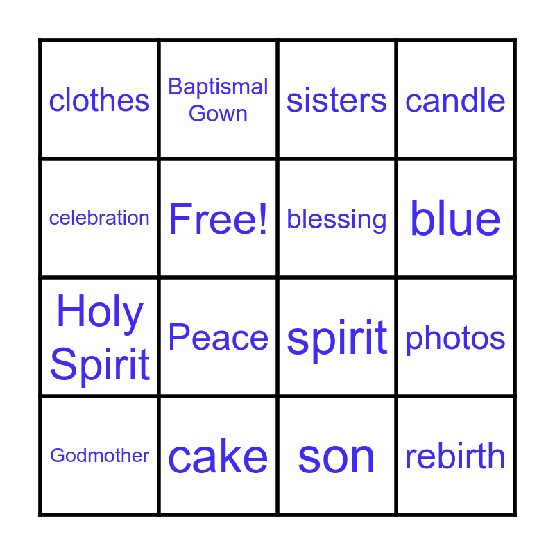 This bingo card has 51 words: Jaxson, Godmother, Godfather, Mother, Father, Holy Water, Baptismal Gown, shoes, Free!, socks, blessing, candle, holy oil, church, Holy Cross, Love, blue, cake, prayer, celebration, photos, Baptism, clothes, Holy Spirit, friends, God, Peace, boy, gathering, sisters, family, memories, white, 6 years old, thankful, kindness, cherish, joy, community, warmest wishes, son, rebirth, life, bible, amen, anoint, spirit, sacrament, offering, tradition and Rosary Neclace.
