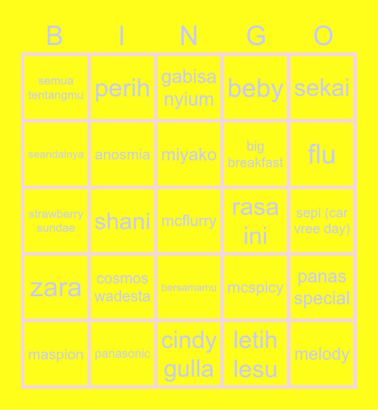 This bingo card has a free space and 24 words: cosmos wadesta, panasonic, miyako, maspion, sekai, semua tentangmu, seandainya, perih, rasa ini, bersamamu, big breakfast, strawberry sundae, mcspicy, panas special, anosmia, letih lesu, sepi (car vree day), gabisa nyium, flu, shani, melody, zara, beby and cindy gulla.