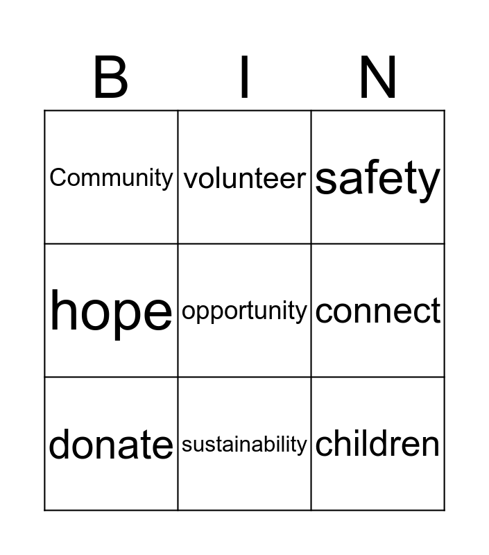 This bingo card has 35 words: training, care, better, donate, grateful, hope, connect, endurance, sustainability, fundraising, generosity, opportunity, listen, share, Community, Thankful, change, possibility, society, stories, healthy, nutrition, diversity, awareness, safety, strength, mentor, help, children, gift, engage, Support, balance, volunteer and leadership.