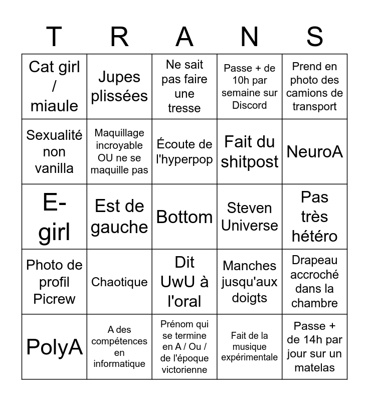 This bingo card has a free space and 32 words: Chaussettes hautes, A des compétences en informatique, Prénom qui se termine en A / Ou / de l'époque victorienne, A plus de 100 heures de jeu sur Darksouls / Céleste / Fallout, NeuroA, Cat girl / miaule, Est de gauche, Dit UwU à l'oral, Passe + de 10h par semaine sur Discord, Passe + de 14h par jour sur un matelas, Sexualité non vanilla, Jupes plissées, Fait de la musique expérimentale, Boit de la boisson énergisante, Photo de profil Picrew, Nail art OU vernis raté, Tatouages kawaii, Steven Universe, Pas très hétéro, PolyA, Chaotique, Weeb, Manches jusqu'aux doigts, Drapeau accroché dans la chambre, E-girl, Maquillage incroyable OU ne se maquille pas, Ne sait pas faire une tresse, Fait du shitpost, Prend en photo des camions de transport, Aime les couleurs pastel, Chaussures à grosses semelles and Écoute de l'hyperpop.