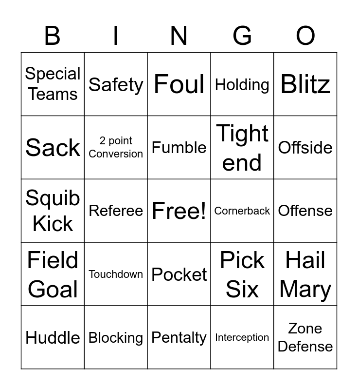 This bingo card has a free space and 25 words: Touchdown, Pentalty, Fumble, Huddle, Blitz, Special Teams, Sack, Safety, Cornerback, Pocket, Tight end, Squib Kick, Pick Six, Hail Mary, 2 point Conversion, Defense, Offense, Foul, Offside, Referee, Zone Defense, Blocking, Field Goal, Holding and Interception.