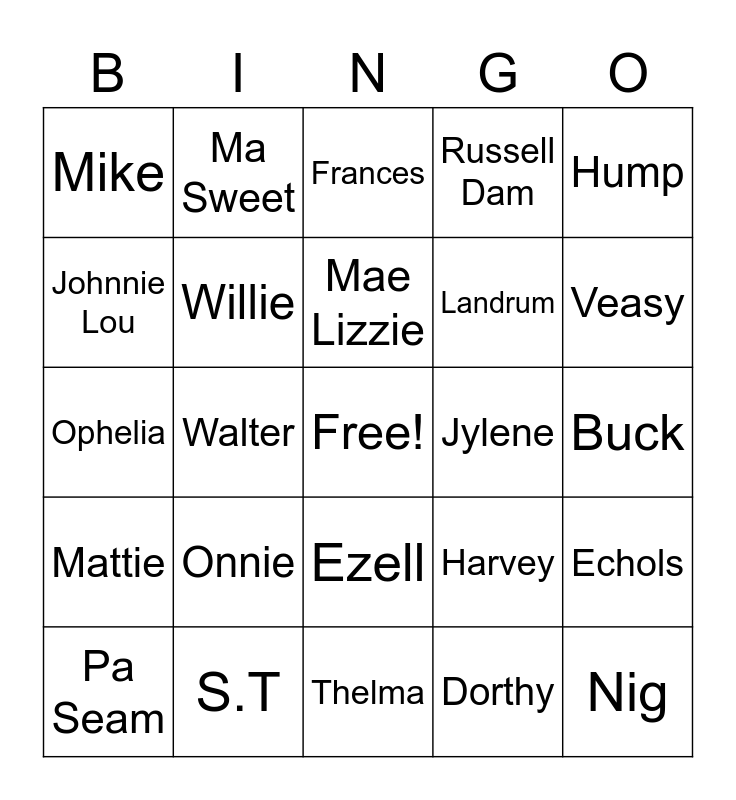 This bingo card has a free space and 29 words: Pa Seam, Seymour, Walter, Rosa, Mike, Frances, Willie, Onnie, Jylene, S.T, Buck, Nig, Thelma, Dorthy, Veasy, Clayton, Ezell, Mattie, Hump, Ophelia, Harvey, Pope, Landrum, Johnnie Lou, Russell Dam, Ma Sweet, Echols, Mae Lizzie and Reunion.