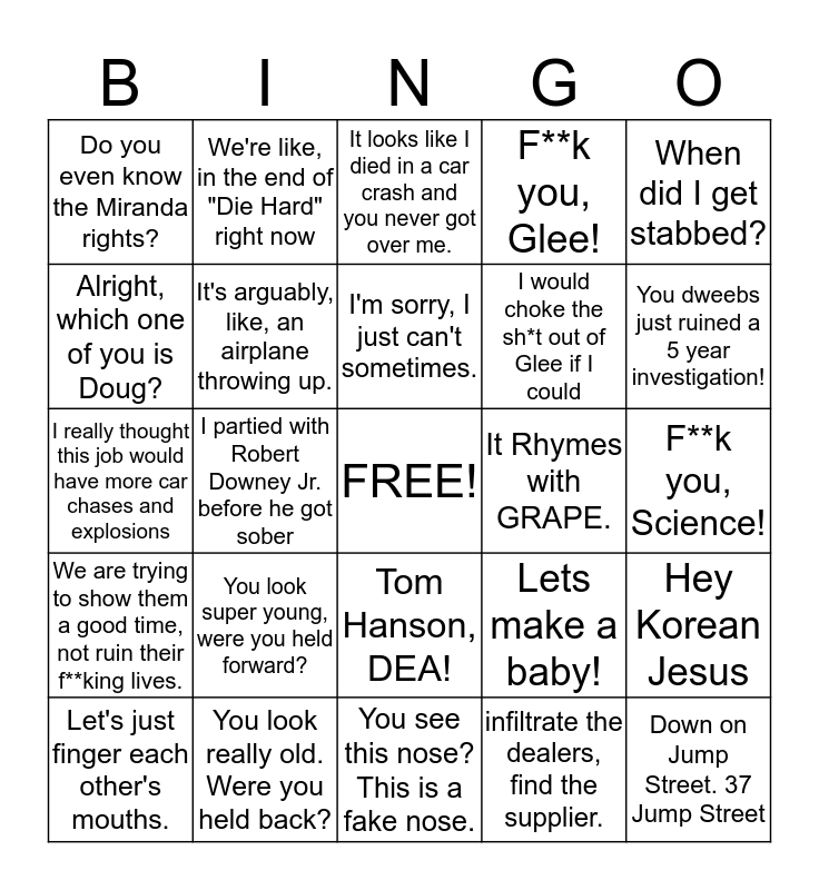 This bingo card has a free space and 24 words: You look super young, were you held forward?, You look really old. Were you held back?, I'm sorry, I just can't sometimes., Let's just finger each other's mouths., When did I get stabbed?, Do you even know the Miranda rights?, Alright, which one of you is Doug?, We're like, in the end of "Die Hard" right now, It Rhymes with GRAPE., Tom Hanson, DEA!, I would choke the sh*t out of Glee if I could, I really thought this job would have more car chases and explosions, Lets make a baby!, Hey Korean Jesus, It's arguably, like, an airplane throwing up., infiltrate the dealers, find the supplier., F**k you, Science!, It looks like I died in a car crash and you never got over me., You dweebs just ruined a 5 year investigation!, I partied with Robert Downey Jr. before he got sober, Down on Jump Street. 37 Jump Street, We are trying to show them a good time, not ruin their f**king lives., F**k you, Glee! and You see this nose? This is a fake nose..