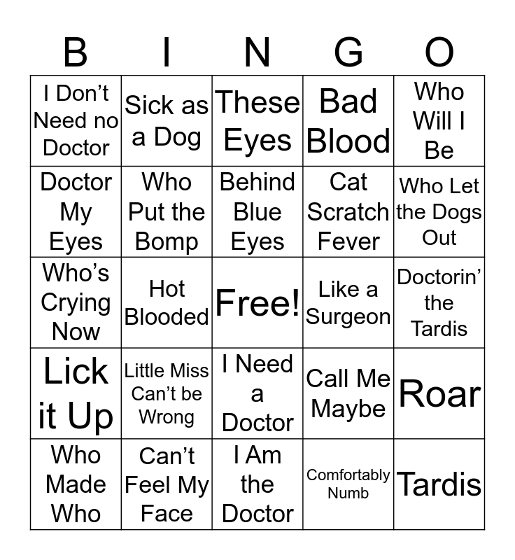 This bingo card has a free space and 46 words: Subterranean Homesick Blues, Tardis, Girls Just Want to Have Fun, I Am the Doctor, Little Miss Can’t be Wrong, Who Do You Love, Sick as a Dog, No Sugar Tonight, Doctor My Eyes, Calling Doctor Love, Who Put the Bomp, Bad Blood, Roar, Call Me Maybe, Kiss Me Deadly, Somebody Get me a Doctor, Behind Blue Eyes, Like a Surgeon, Who’ll Stop the Rain, Who Will I Be, Hot Blooded, Comfortably Numb, I Don’t Need no Doctor, Cat Scratch Fever, Doctor Feelgood, Who Let the Dogs Out, Who Made Who, Firework, I Need a Doctor, Lick it Up, American Woman, Dr. Greenthumb, Who Knew, Sick Again, Who’s that Girl, Can’t Feel My Face, Doctorin’ the Tardis, Pinball Wizard, Still D.R.E., Who Can it Be Now, Bad Case of Loving You (Doctor, Doctor), These Eyes, Who’s Crying Now, The Man Who Sold the World, Stitches and Doctor Who Opening Credits.