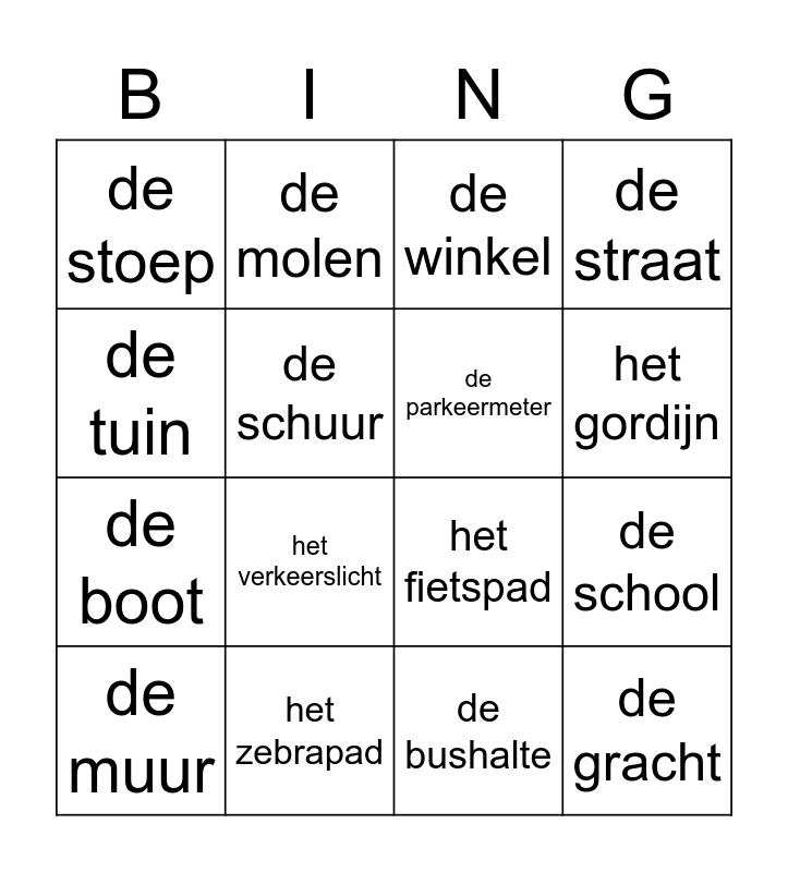 This bingo card has 16 words: het zebrapad, de school, de winkel, de stoep, de boot, de molen, het fietspad, de bushalte, de tuin, de schuur, de muur, de straat, het verkeerslicht, het gordijn, de parkeermeter and de gracht.