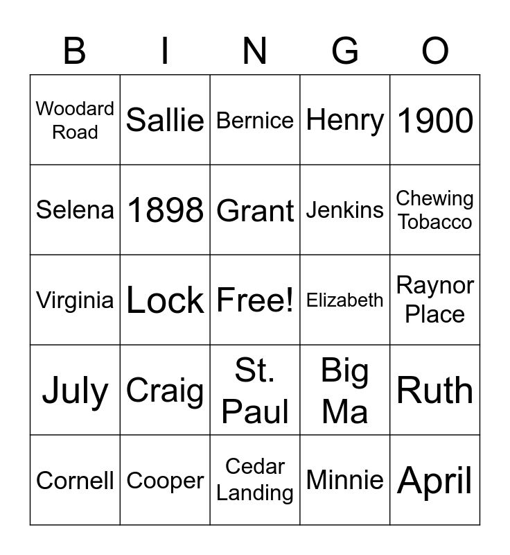 This bingo card has a free space and 34 words: Apple Butter, Minnie, Freeman, Just Keep Living, July, 1898, 1900, Cornell, Sallie, Fannie, Grant, Bernice, 8, New York, Elizabeth, Chewing Tobacco, Cooper, Virginia, Craig, Big Ma, St. Paul, Peterson Grove, Woodard Road, Raynor Place, Cedar Landing, April, Henry, William, Jenkins, Selena, Lonnie, Lock, Ruth and Willie Mae.