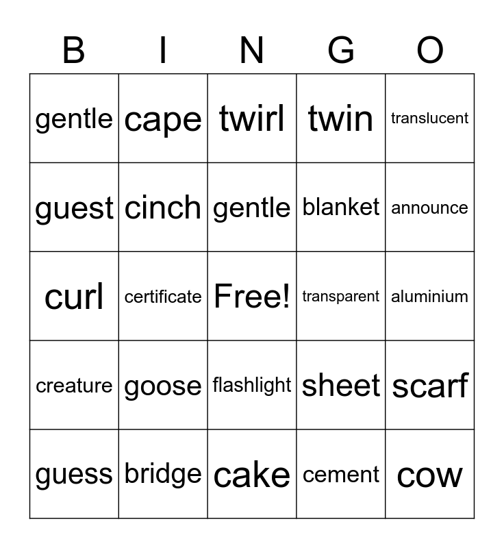 This bingo card has a free space and 69 words: opaque, aluminium, sponge, peace, bridge, remember, twin, sheet, translucent, genius, scarf, orange, gentle, twirl, umbrella, certificate, flashlight, blanket, strawberry, creature, transparent, sheet, announce, streak, goose, cougar, gel, come, cement, game, cape, germs, guitar, cycle, city, cube, cylinder, coat, guest, cube, goose, cow, guitar, cycle, cereal, guess, cup, gone, golf, cinch, gentle, Free!, cell, cake, gerbil, gave, cone, cent, gum, curl, circle, gate, carpet, gist, giant, celery, gold, cone and couch.