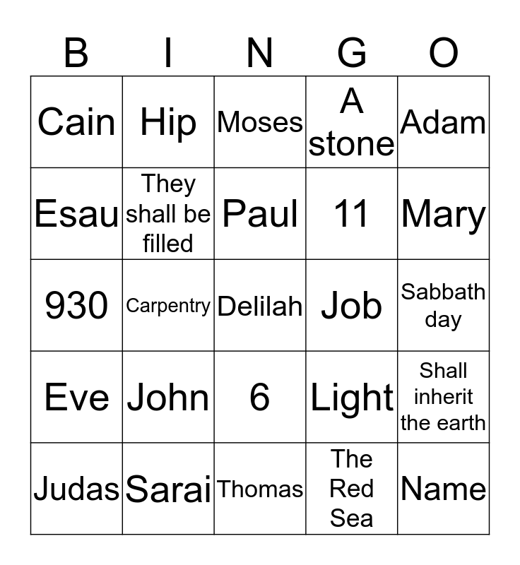 This bingo card has 25 words: John, Thomas, Paul, Judas, Adam, Cain, Esau, Hip, Job, 6, 11, 930, Light, Shall inherit the earth, They shall be filled, Name, Sabbath day, Moses, Mary, Carpentry, Delilah, Sarai, Eve, A stone and The Red Sea.