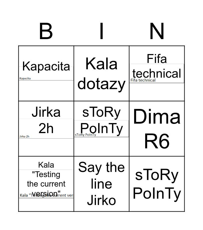This bingo card has 7 images, a free space and 17 words: Say the line Jirko, Dima R6, Fifa technical, Kapacita, Kala dotazy, Jirka 2h, Nikdo nemá obstacle, Kala "Testing the current version", Say the line Jirko, Dima R6, Fifa technical, Kapacita, sToRy PoInTy, Kala dotazy, Jirka 2h, Nikdo nemá obstacle and Kala "Testing the current version".