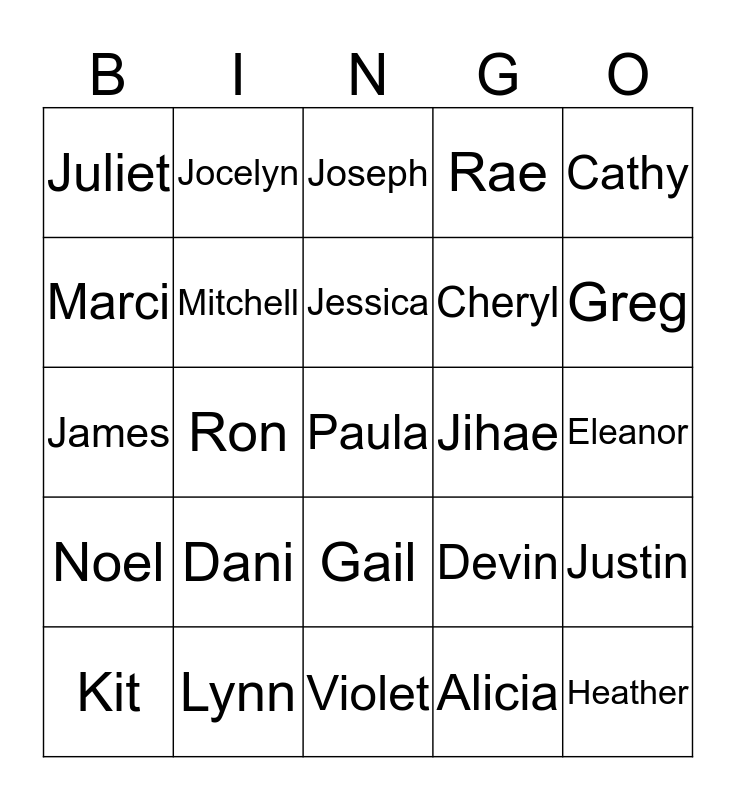 This bingo card has 25 words: Dani, Violet, Jessica, Kit, Cathy, Juliet, Marci, Jocelyn, Jihae, Gail, Cheryl, James, Devin, Justin, Mitchell, Heather, Eleanor, Joseph, Greg, Ron, Paula, Lynn, Noel, Rae and Alicia.