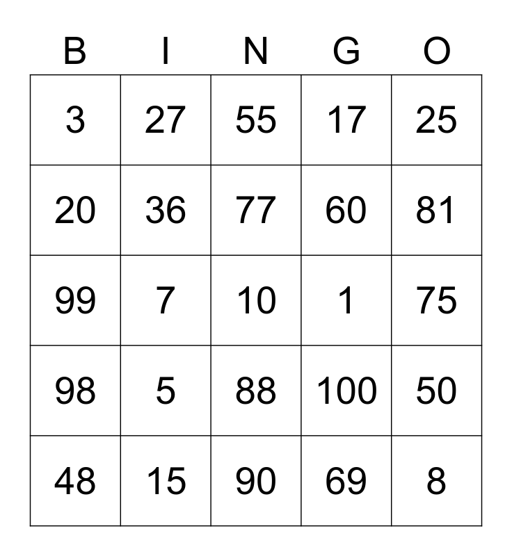 This bingo card has a free space and 24 words: 5, 15, 77, 48, 25, 3, 20, 27, 1, 88, 60, 99, 100, 50, 36, 69, 75, 55, 81, 7, 8, 98, 17 and 90.