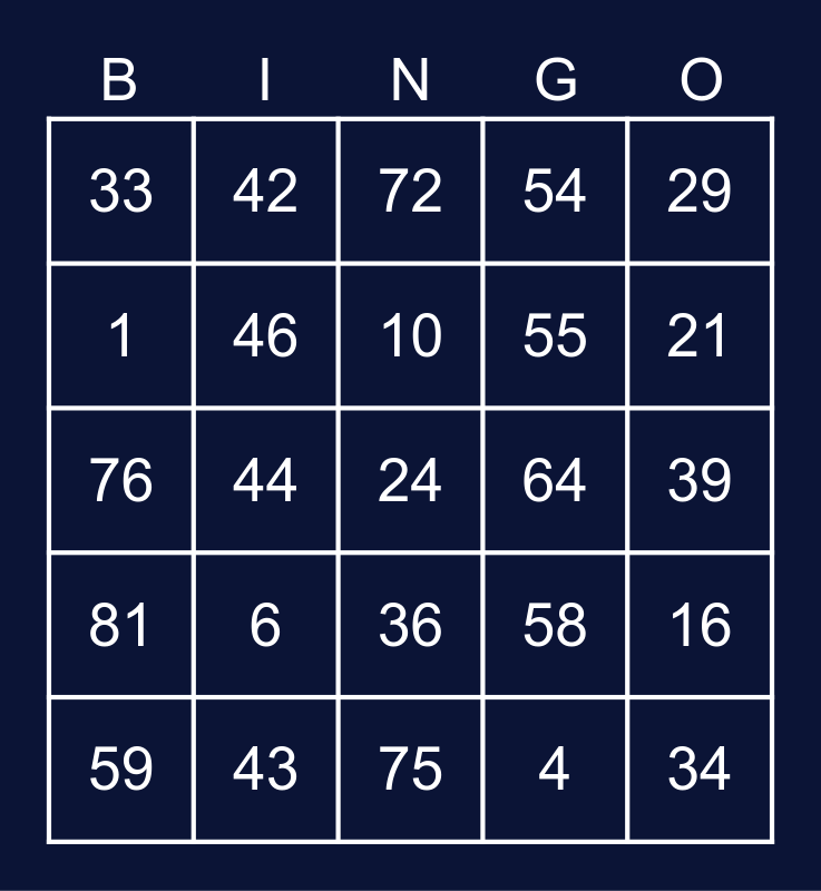 This bingo card has a free space and 24 words: 6, 43, 10, 59, 29, 33, 1, 42, 64, 36, 55, 76, 58, 16, 46, 4, 39, 72, 21, 44, 34, 81, 54 and 75.