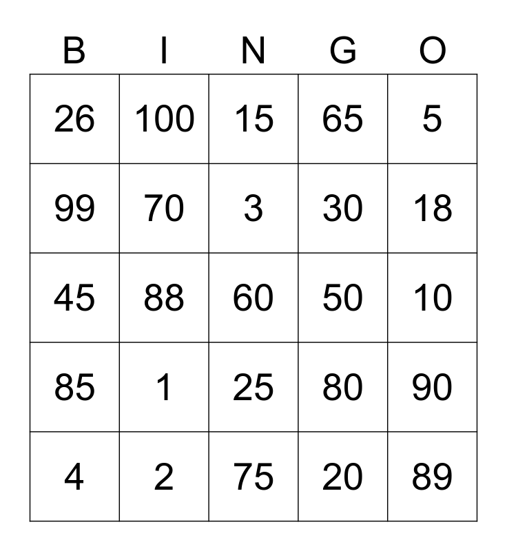 This bingo card has a free space and 24 words: 1, 2, 3, 4, 5, 26, 99, 100, 50, 25, 30, 45, 80, 90, 70, 20, 10, 15, 18, 88, 89, 85, 65 and 75.