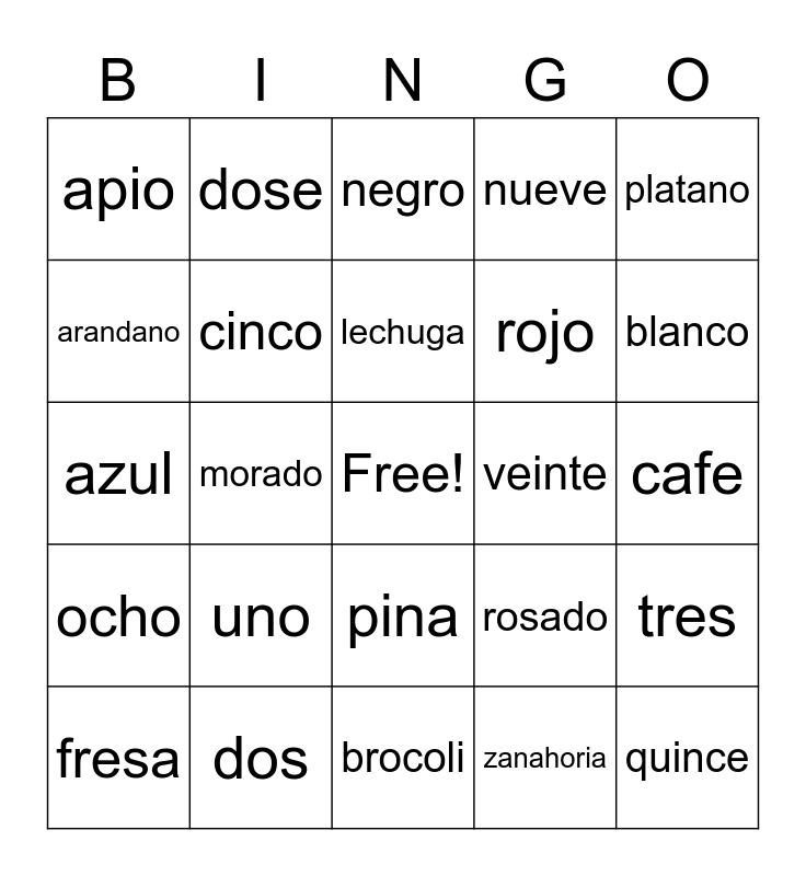 This bingo card has a free space and 24 words: uno, dos, lechuga, fresa, platano, apio, arandano, dose, veinte, pina, rojo, azul, rosado, tres, cinco, zanahoria, cafe, negro, blanco, morado, quince, ocho, nueve and brocoli.