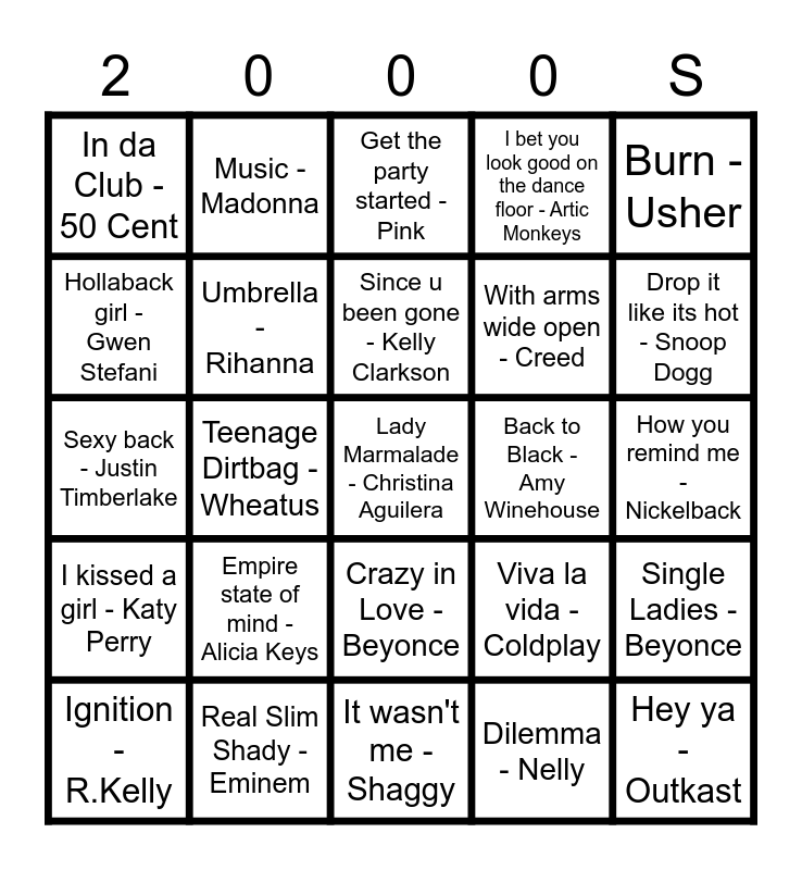 This bingo card has 30 words: Real Slim Shady - Eminem, Poker Face - Lady Gaga, Teenage Dirtbag -Wheatus, Maria Maria-Santana, In da Club - 50 Cent, Get the party started - Pink, Umbrella - Rihanna, Crazy in Love - Beyonce, Back to Black -Amy Winehouse, It wasn't me - Shaggy, How you remind me - Nickelback, Lady Marmalade - Christina Aguilera, Dilemma - Nelly, Hey ya - Outkast, Drop it like its hot - Snoop Dogg, Hips don't lie - Shakira, Viva la vida - Coldplay, I kissed a girl - Katy Perry, Empire state of mind - Alicia Keys, Burn - Usher, Sexy back - Justin Timberlake, You're beautiful - James Blunt, Music - Madonna, With arms wide open - Creed, Hollaback girl - Gwen Stefani, I bet you look good on the dance floor - Artic Monkeys, Single Ladies - Beyonce, Ignition - R.Kelly, Since u been gone - Kelly Clarkson and Seven Nation Army - White Stripes.