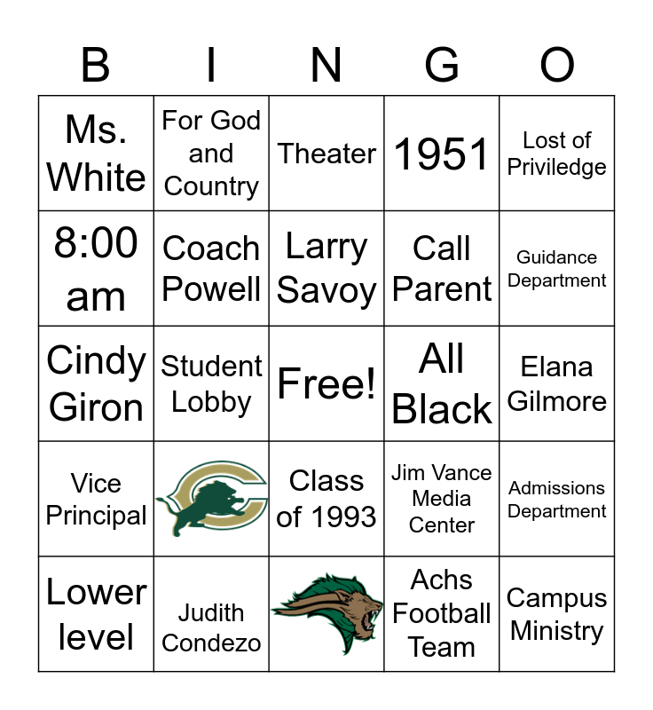 This bingo card has 2 images, a free space and 22 words: Judith Condezo, Larry Savoy, Lower level, Lost of Priviledge, Ms. White, 8:00 am, For God and Country, All Black, Class of 1993, Call Parent, Cindy Giron, Jim Vance Media Center, Admissions Department, Coach Powell, Achs Football Team, Elana Gilmore, Theater, Guidance Department, Student Lobby, Campus Ministry, Vice Principal and 1951.