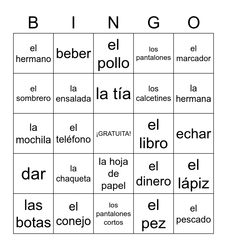 This bingo card has a free space and 95 words: el perro, el gato, el pez, el hombre, la mujer, la chica, el chico, el conejo, la serpiente, el pato, el pájaro, el abuelo, la abuela, la tía, el tío, el hermano, la hermana, el padre, la madre, la camisa, la falda, la blusa, la corbata, la camiseta, los pantalones, el sombrero, la bufanda, los calcetines, los zapatos, el vestido, la chaqueta, la gorra, el impermeable, el abrigo, las botas, las sandalias, los pantalones cortos, los guantes, la mochila, el cuaderno, el lápiz, el teléfono, la hoja de papel, el marcador, el dinero, el libro, la mesa, la silla, la bandera, la ventana, la puerta, la pluma, la carpeta, la goma, el reloj, la computadora, las gafas, el pastel, la hamburguesa, las papas fritas, la ensalada, la manzana, las uvas, el pan, el huevo, el jamón, el queso, la lechuga, el pollo, el bistec, el helado, la sopa, el pescado, la piña, la zanahoria, las judías verdes, caminar, cantar, comer, beber, gritar, estudiar, leer, pegar, echar, dar, tomar, tocar, poner, levantar, bailar, correr, dibujar, escribir and jugar.