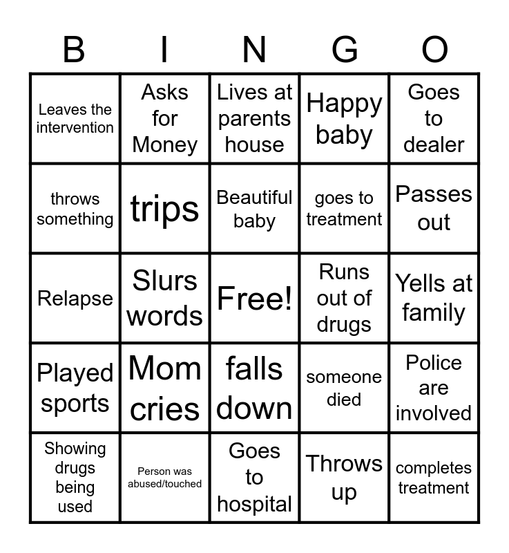 This bingo card has a free space and 24 words: Mom cries, Person was abused/touched, Beautiful baby, Showing drugs being used, Goes to dealer, Leaves the intervention, throws something, Asks for Money, Runs out of drugs, falls down, goes to treatment, Relapse, someone died, Police are involved, trips, Throws up, Yells at family, Lives at parents house, Passes out, Slurs words, completes treatment, Played sports, Happy baby and Goes to hospital.