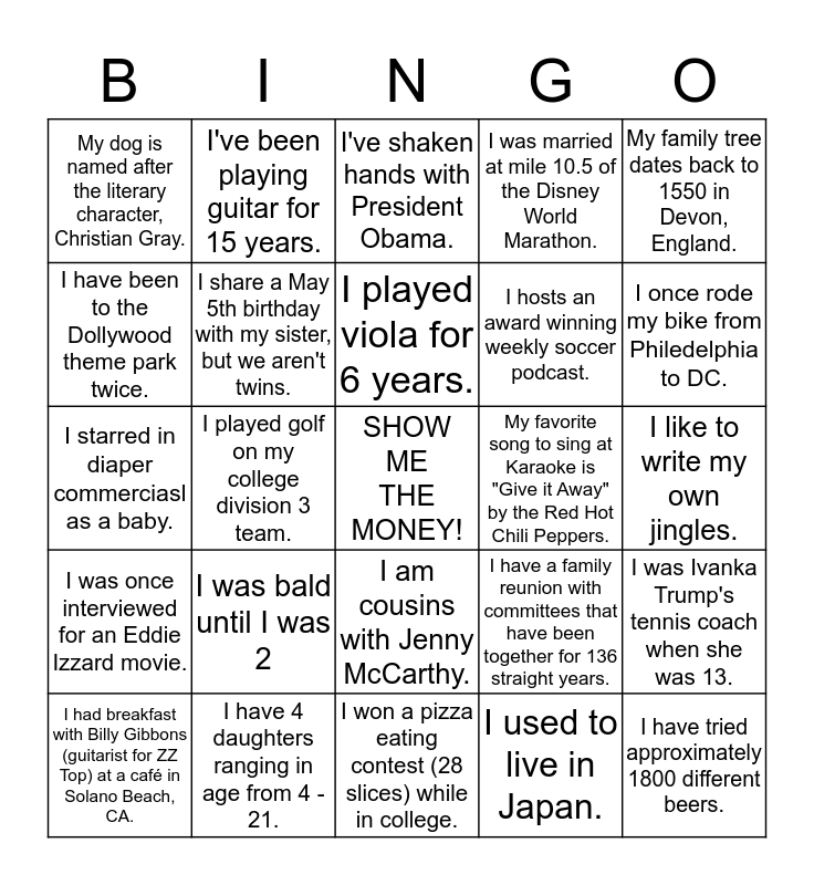 This bingo card has a free space and 28 words: I was Ivanka Trump's tennis coach when she was 13., I have sky dived over the Great Barrier Reef., I hosts an award winning weekly soccer podcast., I used to live in Japan., I have been to the Dollywood theme park twice., I've shaken hands with President Obama., I've been playing guitar for 15 years., I was once interviewed for an Eddie Izzard movie., My favorite song to sing at Karaoke is "Give it Away" by the Red Hot Chili Peppers., I had breakfast with Billy Gibbons (guitarist for ZZ Top) at a café in Solano Beach, CA., I starred in diaper commerciasl as a baby., I was married at mile 10.5 of the Disney World Marathon., I have 4 daughters ranging in age from 4 - 21., I won a pizza eating contest (28 slices) while in college., I once rode my bike from Philedelphia to DC., I had curly hair as a child., I was bald until I was 2, I share a May 5th birthday with my sister, but we aren't twins., I played viola for 6 years., I am cousins with Jenny McCarthy., My dog is named after the literary character, Christian Gray., If I could start my life over, I'd be an interior designer., I have tried approximately 1800 different beers., I played golf on my college division 3 team., I like to write my own jingles., I have a family reunion with committees that have been together for 136 straight years., My family tree dates back to 1550 in Devon, England. and I was educated in 4 different countries (Morocco, France, US, and Canada.