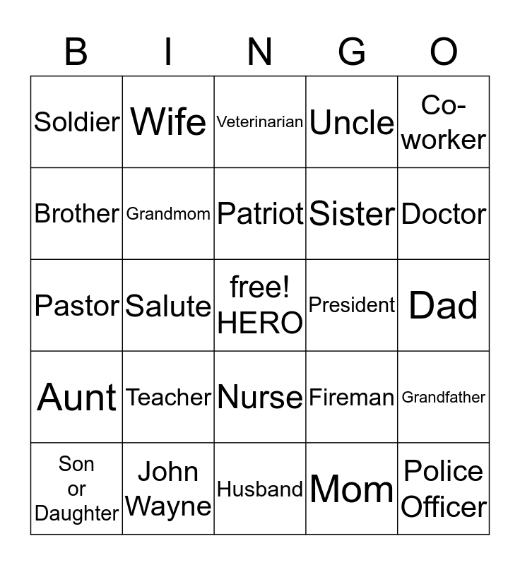 This bingo card has a free space and 24 words: Teacher, John Wayne, Patriot, Son or Daughter, Co-worker, Soldier, Brother, Wife, President, Nurse, Sister, Pastor, Fireman, Grandfather, Grandmom, Mom, Dad, Veterinarian, Doctor, Salute, Police Officer, Aunt, Uncle and Husband.