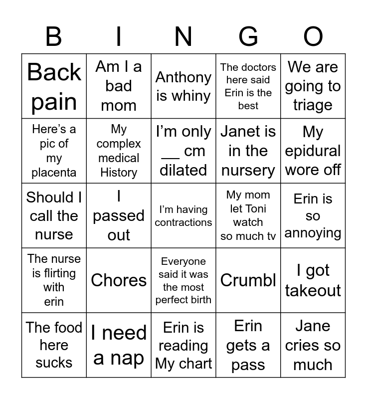 This bingo card has a free space and 24 words: Chores, I need a nap, I’m only __ cm dilated, The food here sucks, We are going to triage, Back pain, Here’s a pic of my placenta, Am I a bad mom, My mom let Toni watch so much tv, Everyone said it was the most perfect birth, Janet is in the nursery, Should I call the nurse, Crumbl, I got takeout, My complex medical History, Erin gets a pass, Erin is so annoying, Anthony is whiny, My epidural wore off, I passed out, Jane cries so much, The nurse is flirting with erin, The doctors here said Erin is the best and Erin is reading My chart.