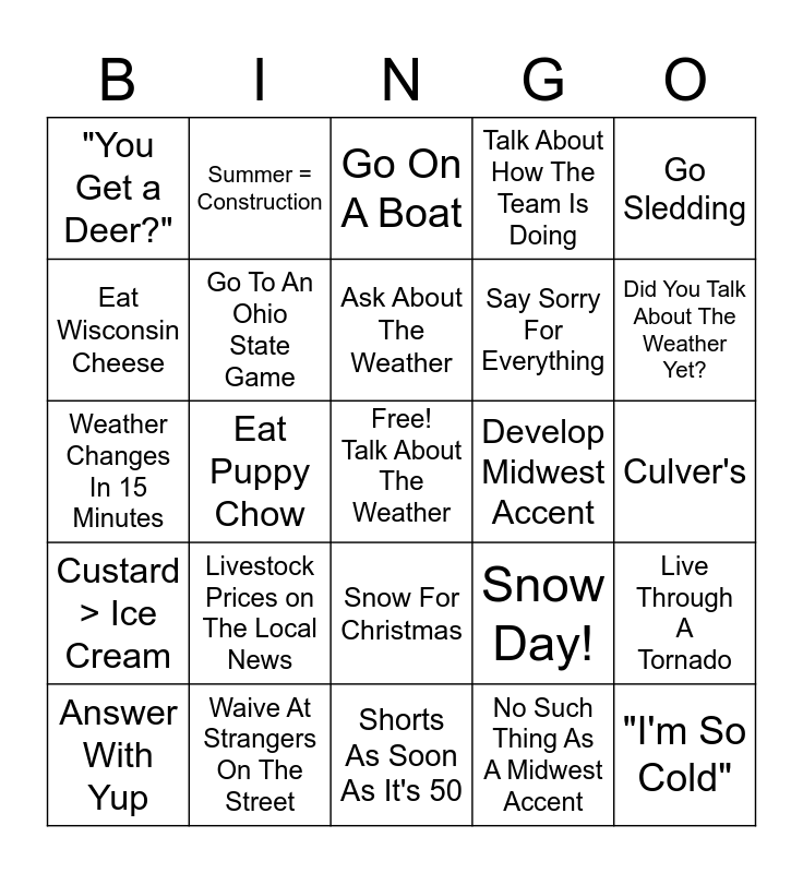 This bingo card has a free space and 24 words: Livestock Prices on The Local News, Waive At Strangers On The Street, Ask About The Weather, Answer With Yup, Go Sledding, "You Get a Deer?", Eat Wisconsin Cheese, Summer = Construction, Develop Midwest Accent, Snow For Christmas, Say Sorry For Everything, Weather Changes In 15 Minutes, Snow Day!, Live Through A Tornado, Go To An Ohio State Game, No Such Thing As A Midwest Accent, Culver's, Go On A Boat, Did You Talk About The Weather Yet?, Eat Puppy Chow, "I'm So Cold", Custard > Ice Cream, Talk About How The Team Is Doing and Shorts As Soon As It's 50.