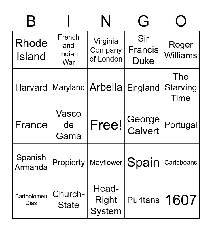 This bingo card has a free space and 26 words: Mayflower, Puritans, Arbella, Church-State, Roger Williams, Rhode Island, Harvard, French and Indian War, Portugal, Spain, England, France, Caribbeans, Bartholomeu Dias, Vasco de Gama, 1492, Sir Francis Duke, Spanish Armanda, Virginia Company of London, 1607, The Starving Time, Head-Right System, George Calvert, Propierty, Maryland and Plymouth Bay.