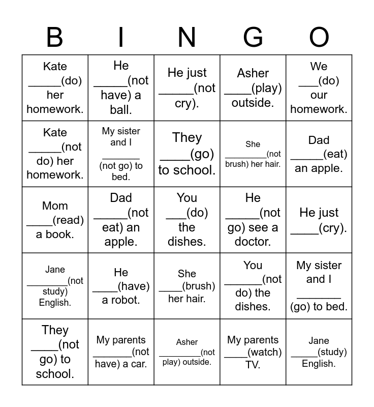 This bingo card has a free space and 24 words: He ____(have) a robot., My parents _______(not have) a car., They ____(go) to school., They ____(not go) to school., We ___(do) our homework., Kate _____(do) her homework., Kate _____(not do) her homework., He _____(not have) a ball., He _____(not go) see a doctor., She ____(brush) her hair., She _________(not brush) her hair., Mom ____(read) a book., You ______(not do) the dishes., My sister and I _______ (go) to bed., My sister and I _______ (not go) to bed., My parents ____(watch) TV., He just ____(cry)., He just _____(not cry)., Dad _____(eat) an apple., Dad _____(not eat) an apple., Jane _____(study) English., Jane ________(not study) English., Asher ____(play) outside. and Asher _________(not play) outside..
